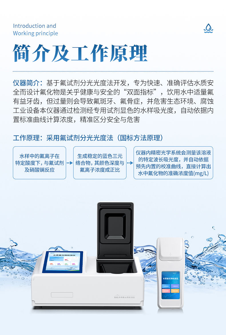 本仪器采用氟试剂分光光度法(国标方法原理)。水样中的氟离子在特定酸度下,与氟试剂及硝酸镧反应,生成稳定的蓝色三元络合物,其颜色深度与氟离子浓度成正比。仪器内的精密光学系统会测量该溶液的特定波长吸光度,并自动依据预先内置的校准曲线,直接计算出水中氟化物的准确浓度值(mg/L)。该方法抗干扰能力强,结果准确可靠。