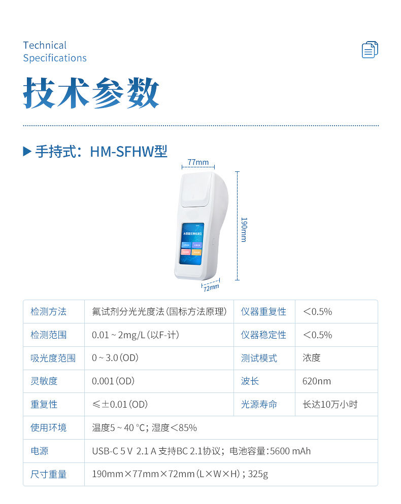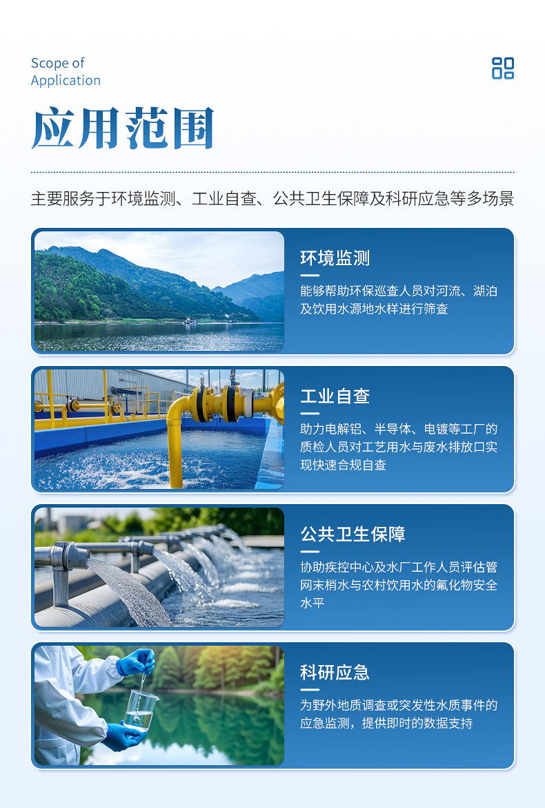 本仪器是快速检测水中氟化物的专业工具,主要服务于环境监测、工业自查、公共卫生保障及科研应急等多类场景。它能够帮助环保巡查人员对河流、湖泊及饮用水源地水样进行筛查;助力电解铝、半导体、电镀等工厂的质检人员对工艺用水与废水排放口实现快速合规自查;协助疾控中心及水厂工作人员评估管网末梢水与农村饮用水的氟化物安全水平;同时也为野外地质调查或突发性水质事件的应急监测,提供即时的数据支持。
