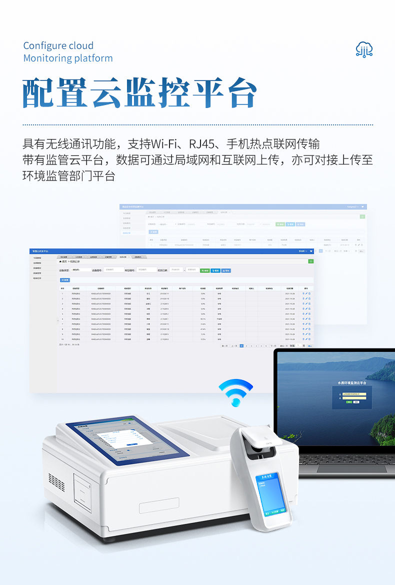 8.仪器带有监管云平台,数据可通过局域网和互联网上传,亦可对接上传至环境监管部门平台。
