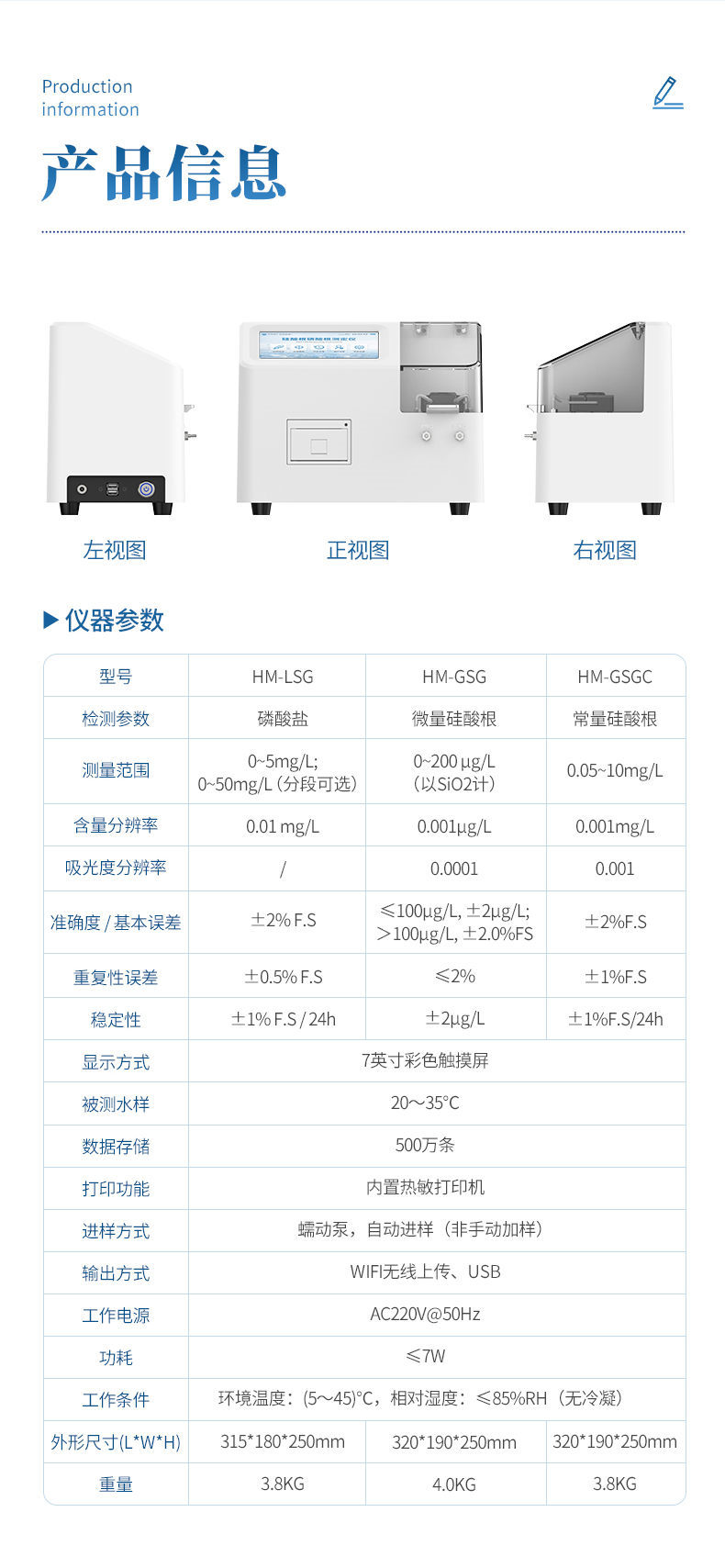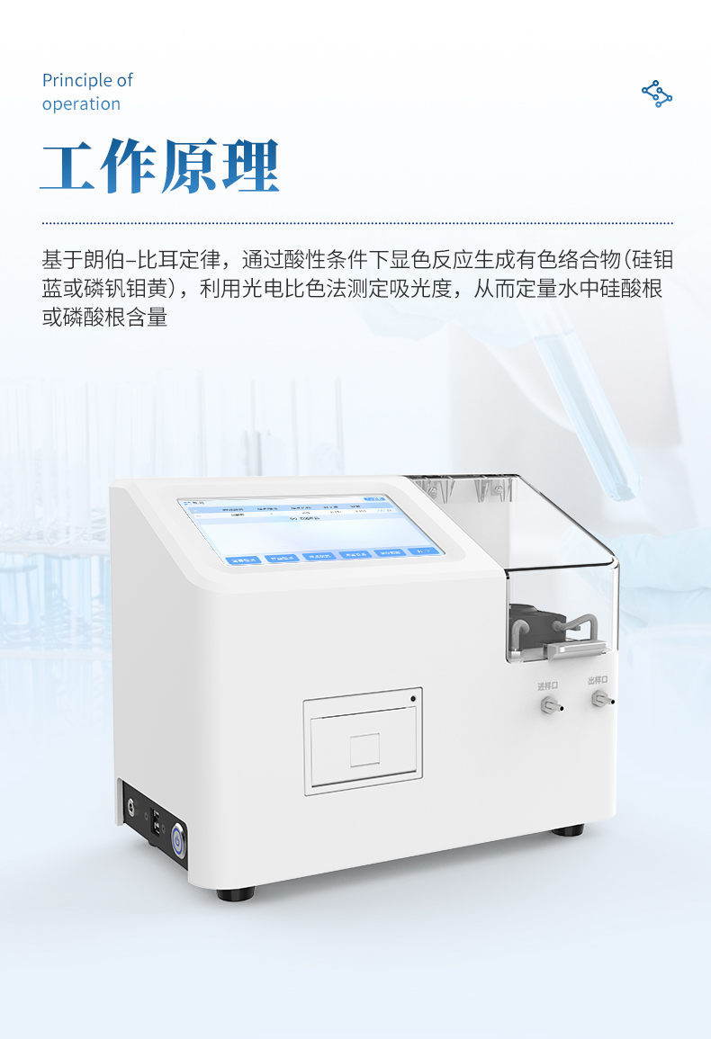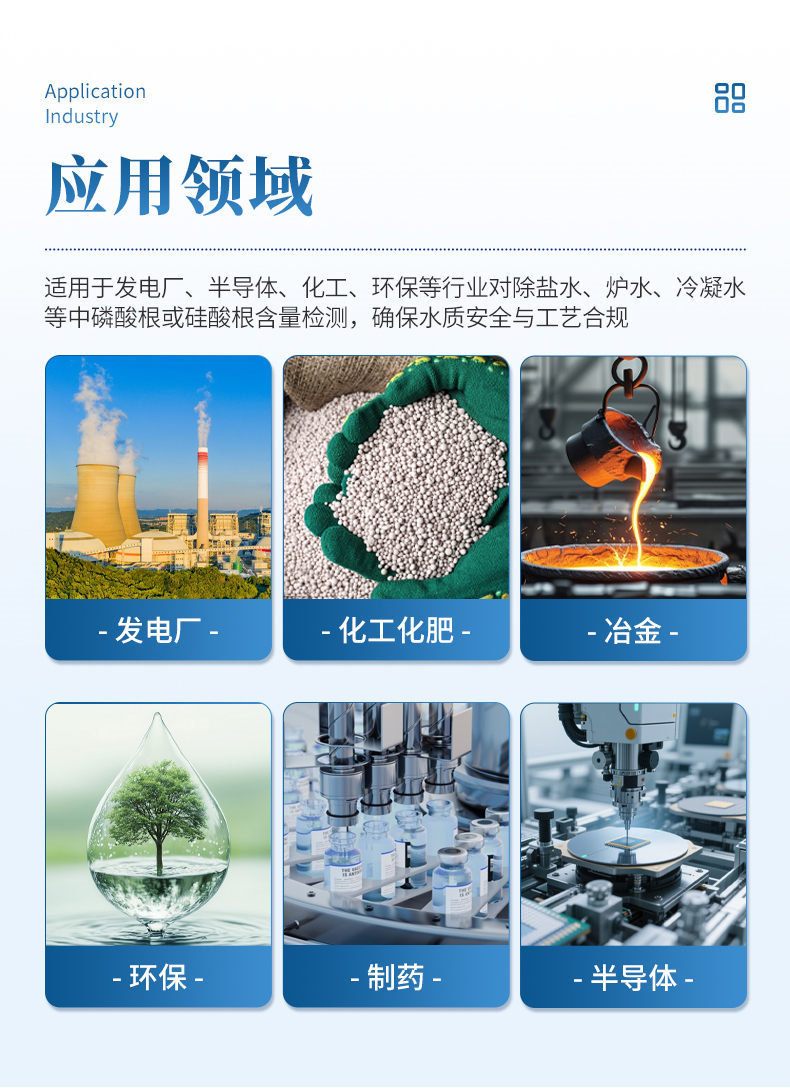 硅酸根测定仪适用于检测样水中微量硅酸根离子的含量。广泛应用于发电厂、化工化肥、冶金、环保、制药、化纤、半导体等行业,适用于除盐水、蒸汽冷凝水、炉水等水中可溶性硅酸根含量的检测分析;参考《GB/T12149-2017工业循环冷却水和锅炉用水中硅的测定》标准设计制造。