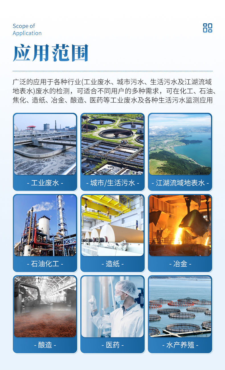 能够广泛的应用于各种行业(工业废水、城市污水、生活污水及江湖流域地表水)废水的检测,可适合不同用户的多种需求,可在化工、石油、焦化、造纸、冶金、酿造、医药等工业废水及各种生活污水监测应用。