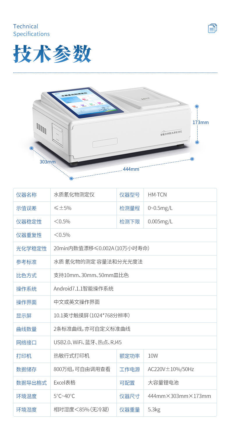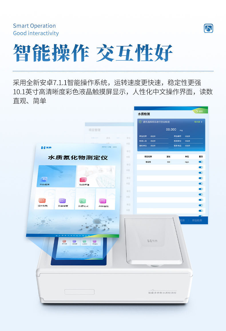 本仪器主要检测水质氰化物和总氰化物含量指标,兼具智能数据分析功能,图表、列表显示数据,分析一目了然;高清晰度彩色液晶触摸显示屏,Android智能操作系统,中文显示界面,中英文键盘,人性化操作,使用更简单。