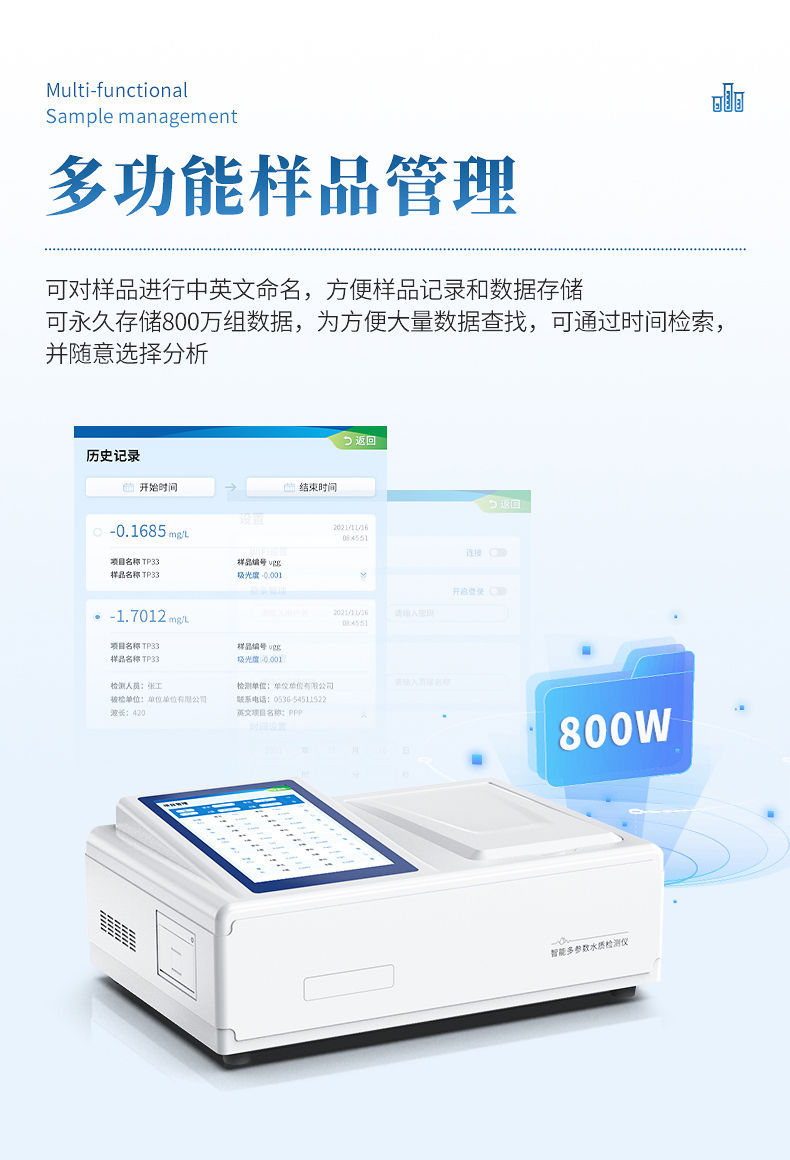 8、仪器可**存储800万组数据,为方便大量数据查找,可通过时间检索,并随意选择分析;