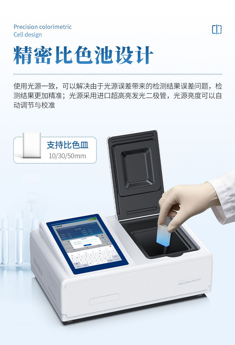 5、支持10mm、30mm、50mm皿比色和φ16mm管比色等比色方式,多元选择,确保测量的准确性;