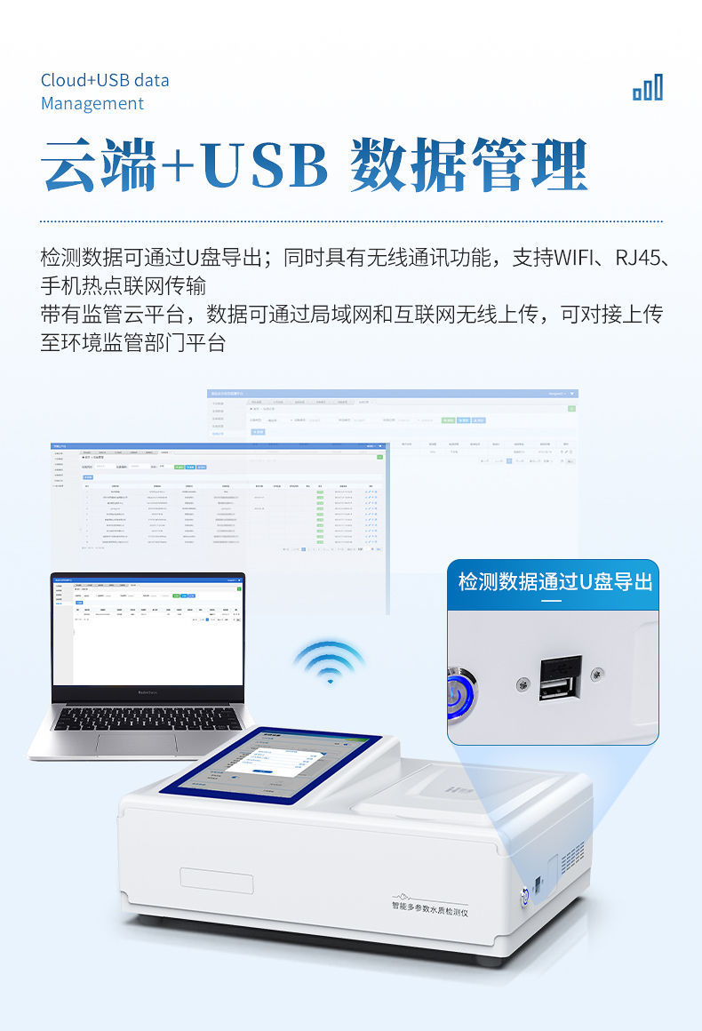 6、检测数据可通过U盘导出;同时具有无线通讯功能,支持WIFI、RJ45、手机热点联网传输,