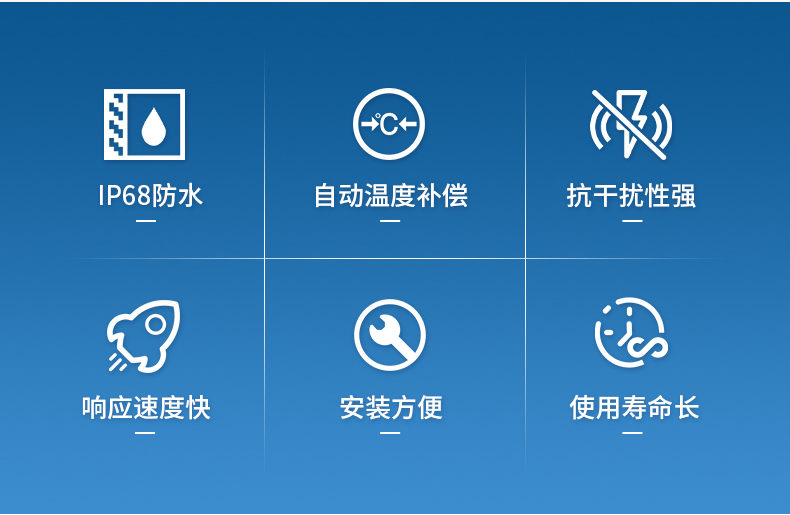 安装方便,简单,3/4NPT管螺纹,便于沉入式安装或安装在管道和罐体性能稳定,使用寿命长